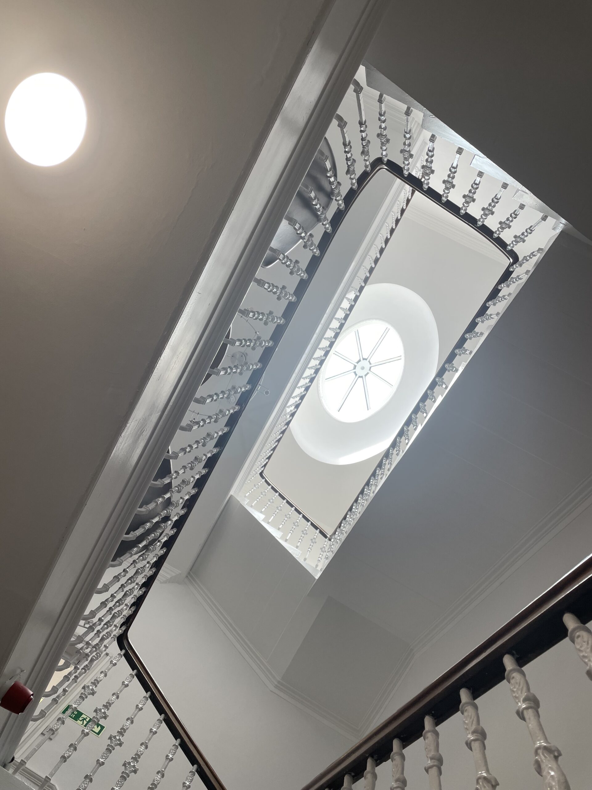 Our skilled operatives were required to strip off damaged paper linings and renew to match the existing wallcovering. Previously painted radiators and metalwork were also thoroughly prepared and decorated as per the client’s specification. In addition, all previously painted cast iron balustrading to the staircases and landings, together with all surfaces to the stone staircase risers and treads, were also prepared and decorated.