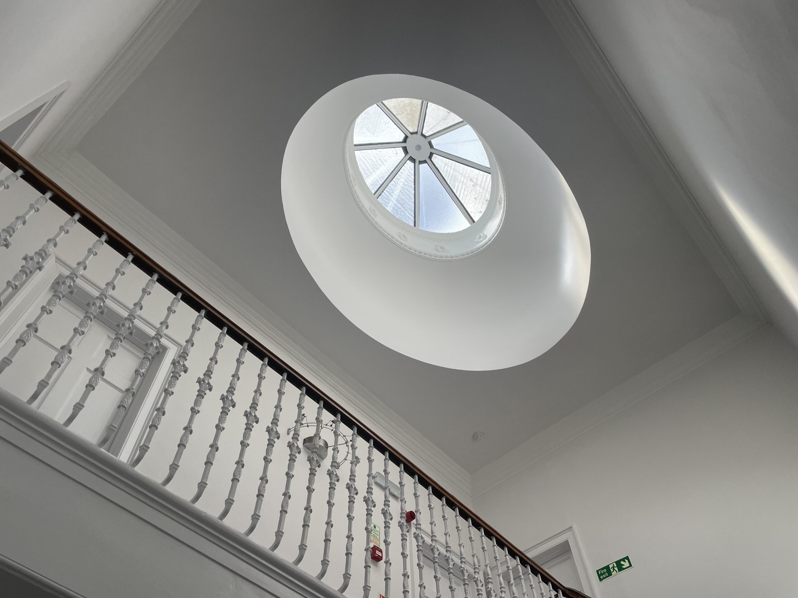 Within this 19th century Georgian Townhouse, specialist scaffolding was erected to enable the safe execution of the decorating works to the high level areas within the stairwell, such as the ceiling, walls, decorative frieze and oculus.