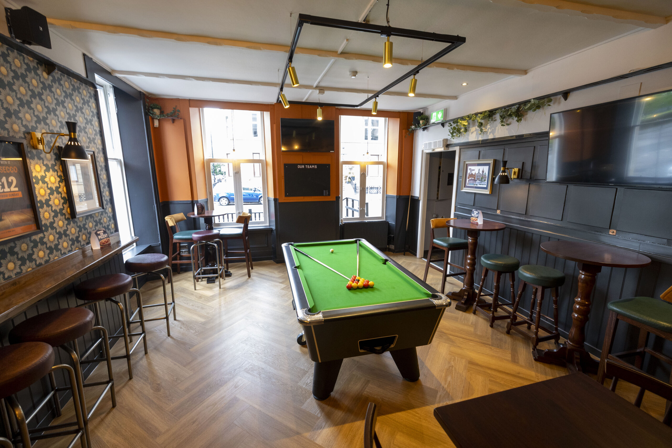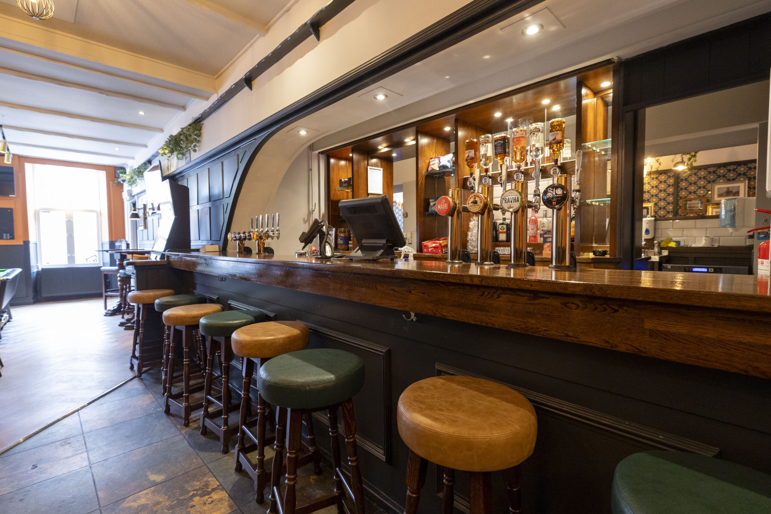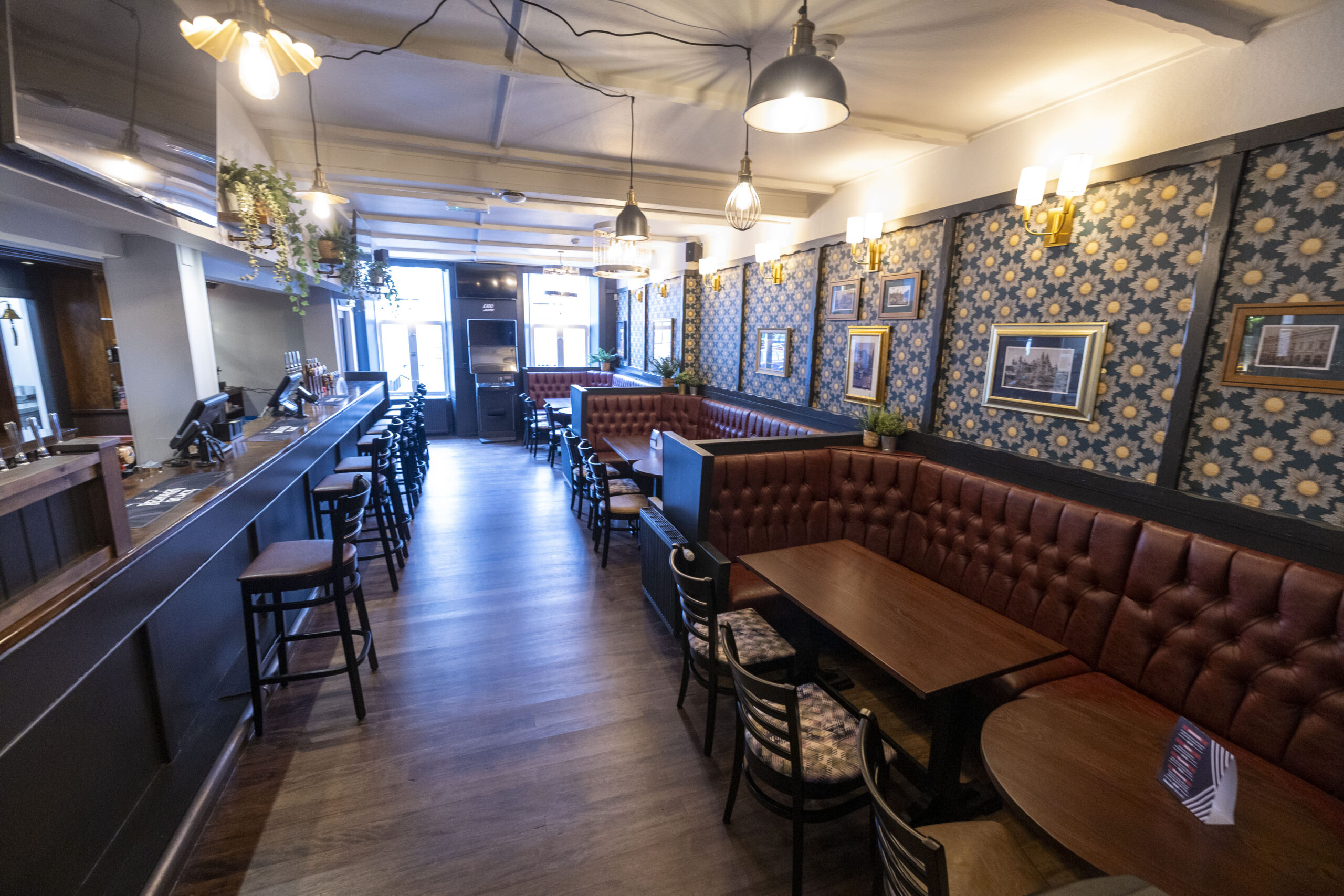 Internally, a new opening was formed through the back bar fittings. The existing back bar was adapted and the under counter shelving replaced. New screens, pot shelves and lighting were installed. The existing timber floor was repaired and then stained with new floor finishes installed within the other remaining areas. The fixed seating was reupholstered and the toilets upgraded. Decoration works were completed throughout which included the hanging of wallcoverings to public areas.